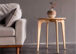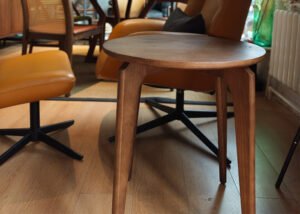 Photo 1 it’s round side table with natural ash, photo 2 it’s solid ash with walnut stain.
