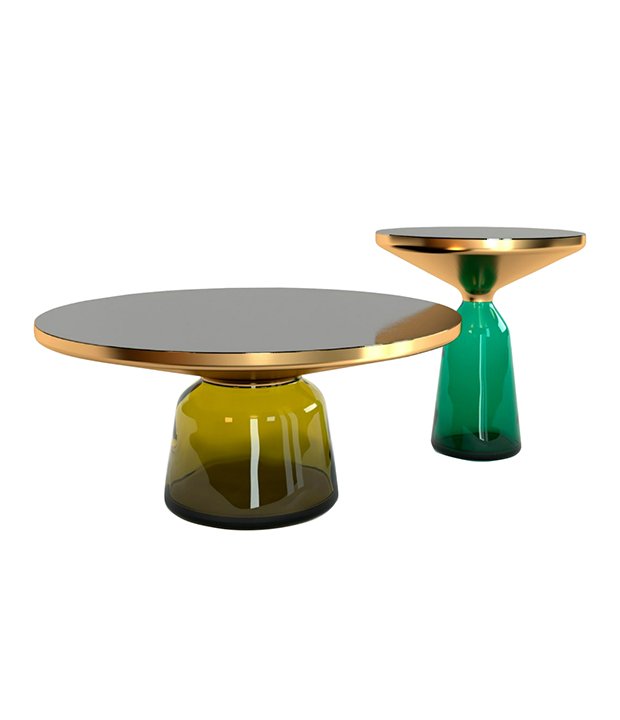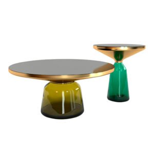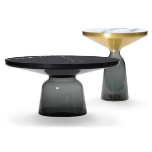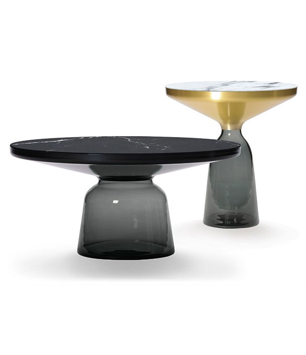 of this hand-made coffee table. The table top of the Bell Coffee Table is made of metal and makes up a harmonious ensemble with the glass base.